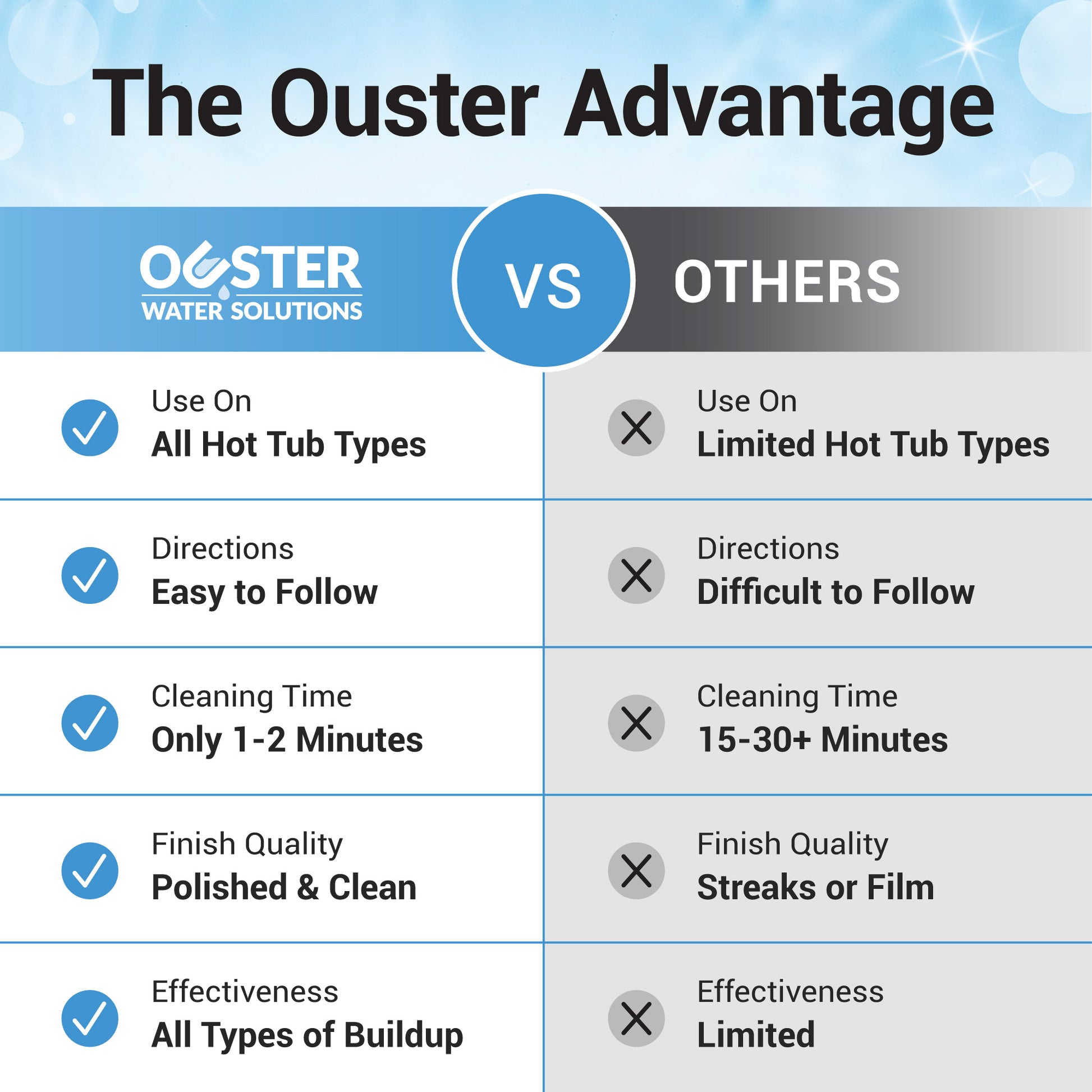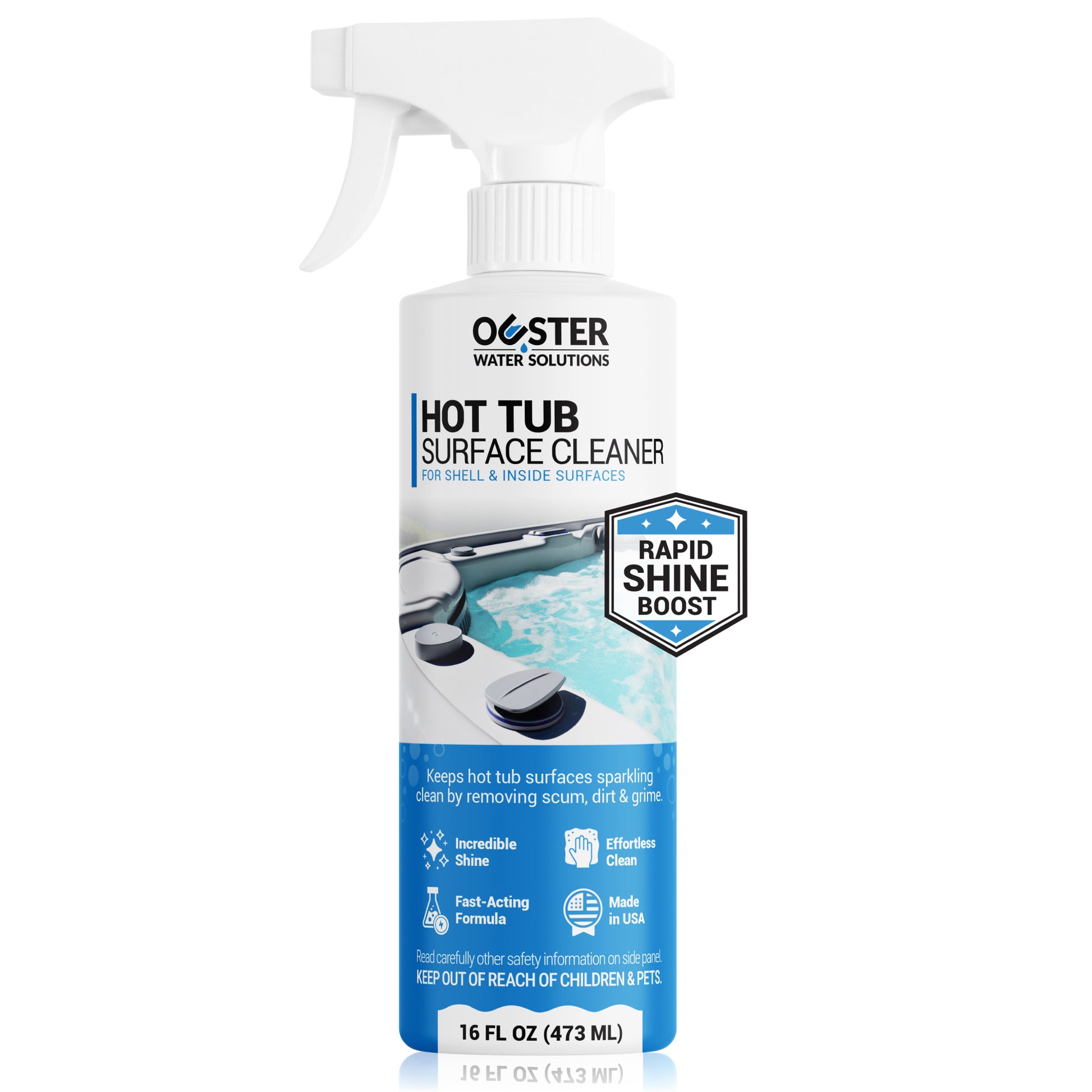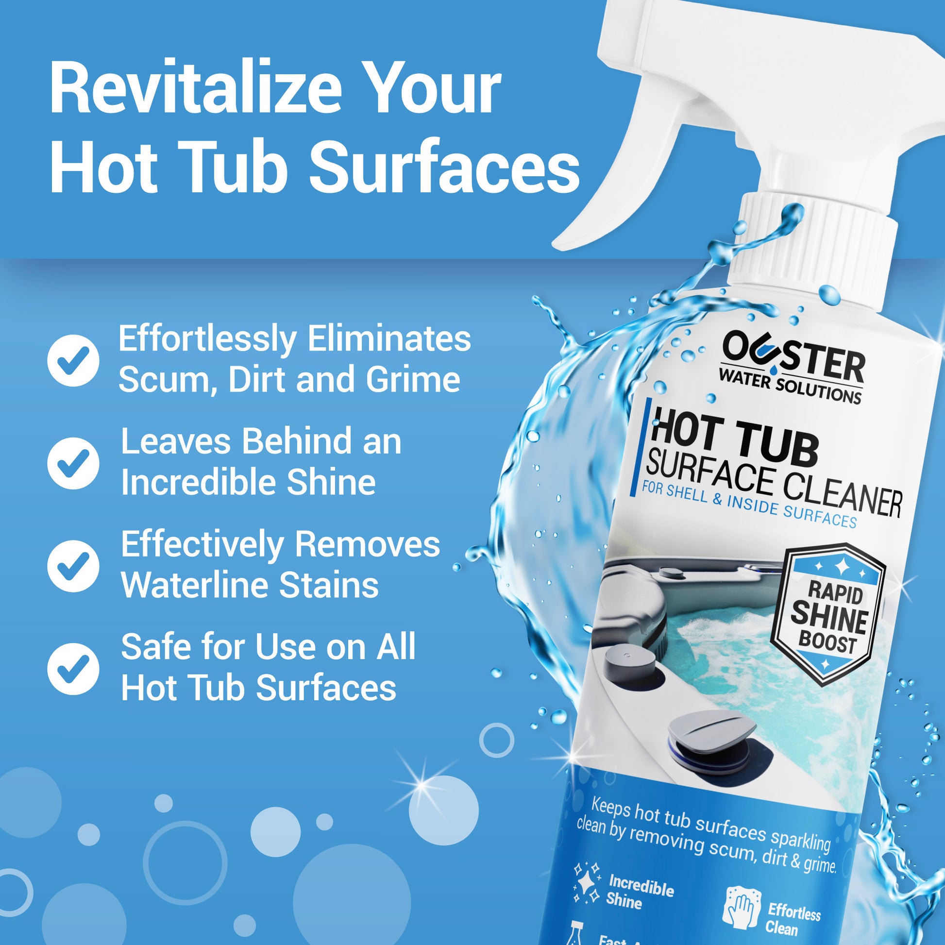 Ouster Hot Tub Surface Cleaner effortlessly removes scum, dirt, and stubborn grime to leave surfaces spotless and sparkling clean. Provides a brilliant, long-lasting shine while maintaining the quality of delicate surfaces. This cleaner can also be used for swim spas, cold plunges and jetted tubs.